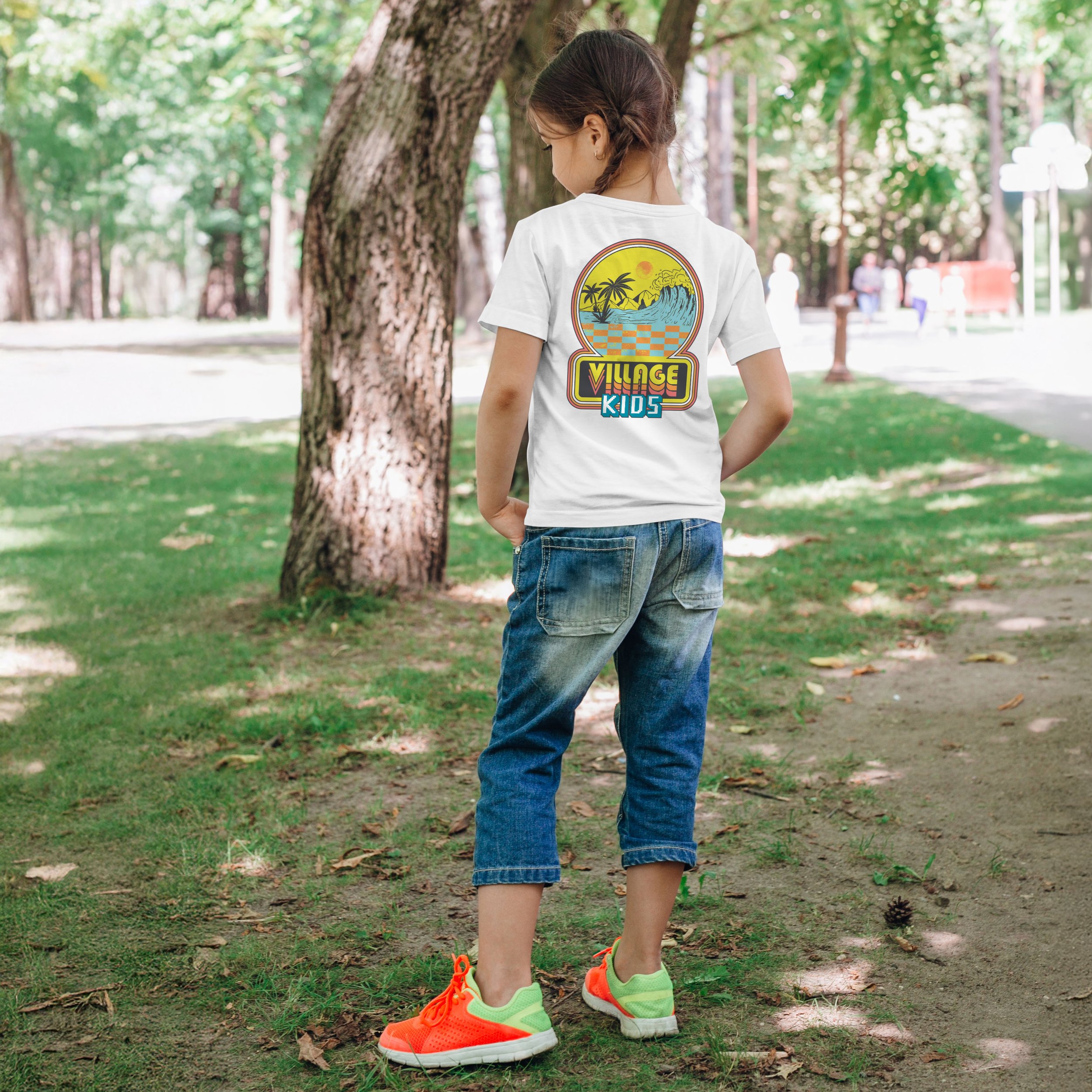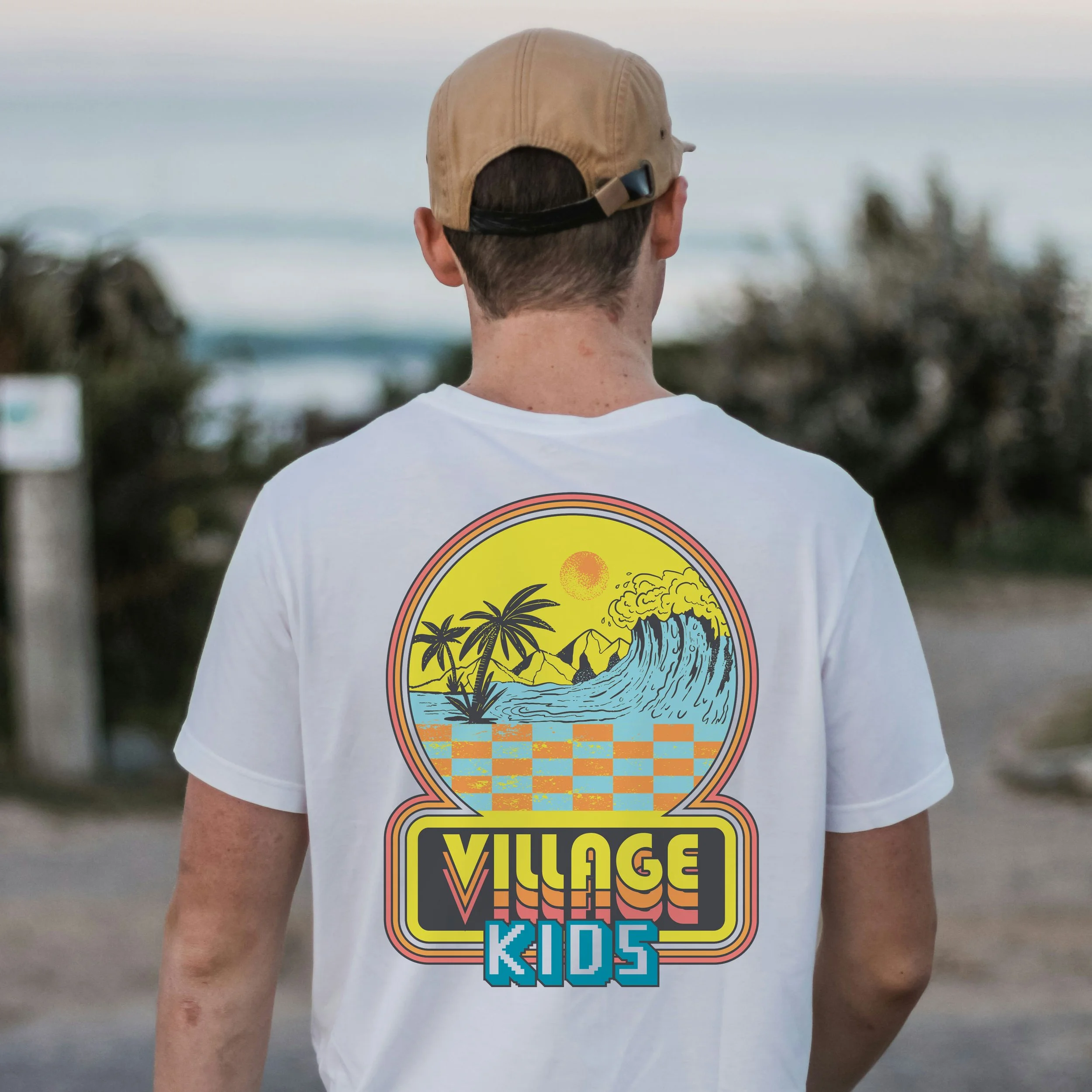For Village Church Irvine’s Vacation Bible School, I designed a retro surf–themed T-shirt with bold, summery colors that captured the excitement and energy of the week. The back features a circular sunset scene with palm trees, ocean waves, and a warm sun, rendered in a vintage 70s/80s–inspired palette of yellows, oranges, teals, and blues. Beneath the scene, a checkerboard pattern adds a playful, nostalgic touch. Inspired by classic arcade visuals, the design also incorporates fun pixel-art elements and bold typography, with the text “VILLAGE KIDS” in thick, rounded lettering that complements the retro vibe. The overall look is youthful, adventurous, and beach-inspired—translating the joy and community of VBS into a memorable, visually striking keepsake that kids and families loved to wear.
